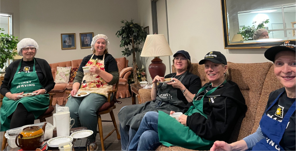 Marianne Irvin, Elisabeth Duckworth, Kim Shay, Nancy Carroll, Cindy Rapley relax in the parlour after serving the community meal.