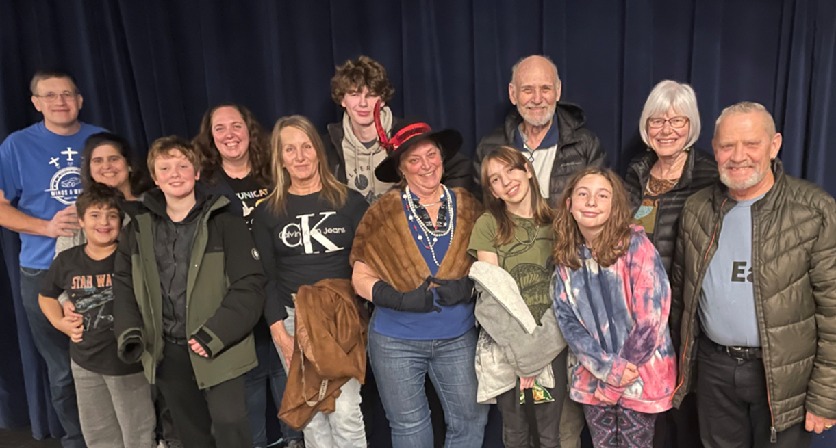 Janet Dickson (centre, wearing the hat) welcomed the youth group to the dress rehearsal of the play she directed at Simcoe Little Theatre in November, 2025.