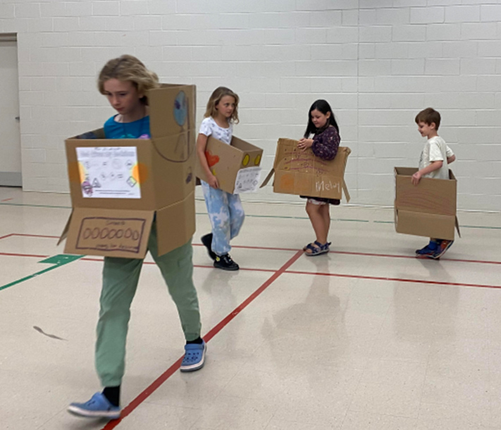 “Driving” around the gym in their cardboard cars